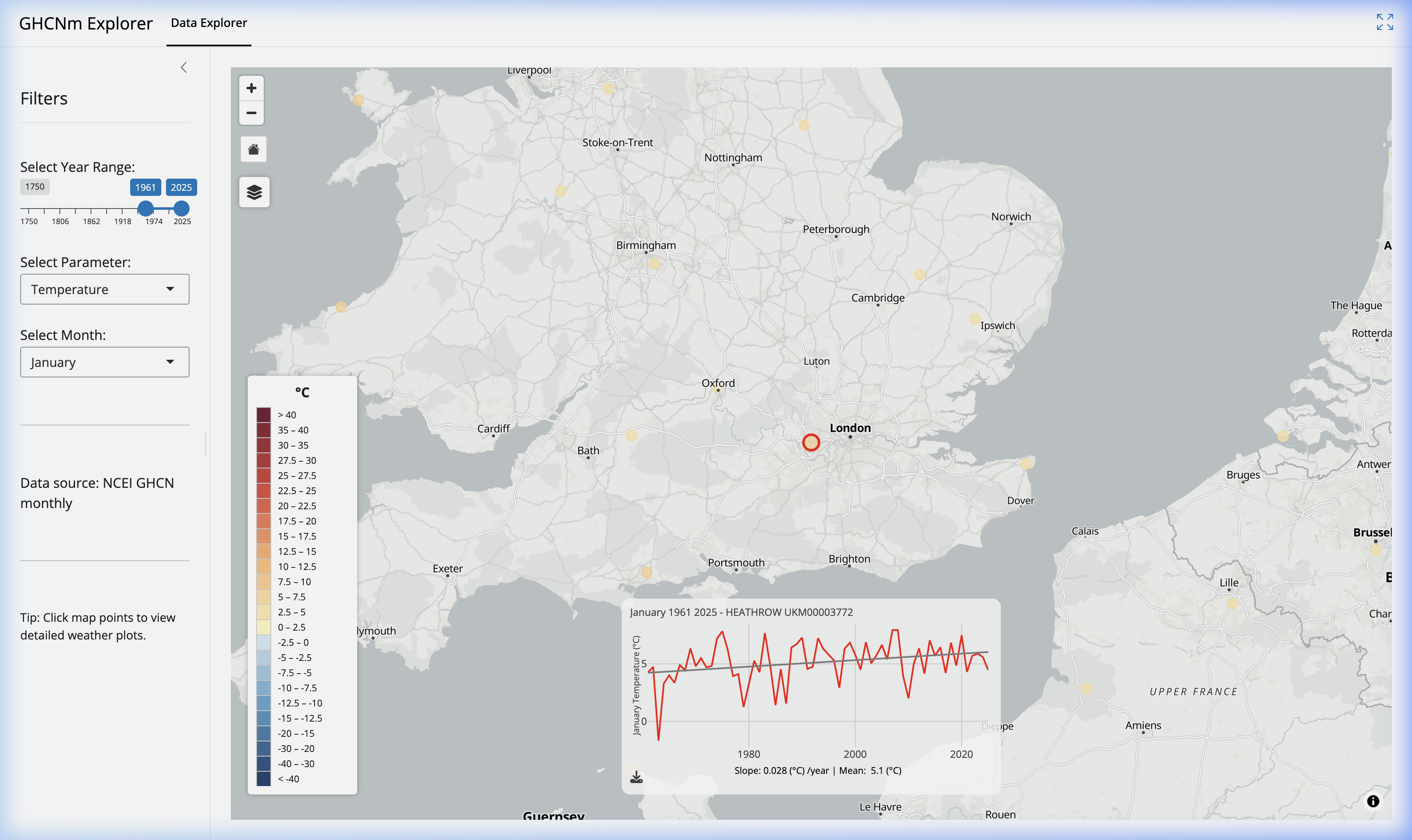With the Climate Explorer GHCNm dashboard, you can independently access this exact dataset to visualize global temperature and precipitation trends across every country in the world.